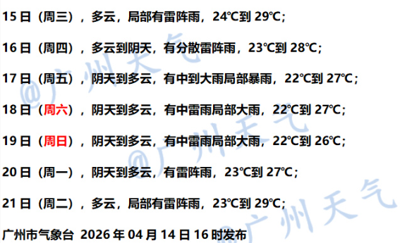 广州市气象台预计,4月15日广州以多云为主。4月16日—17日,天气转不稳定,雷雨渐趋频繁。